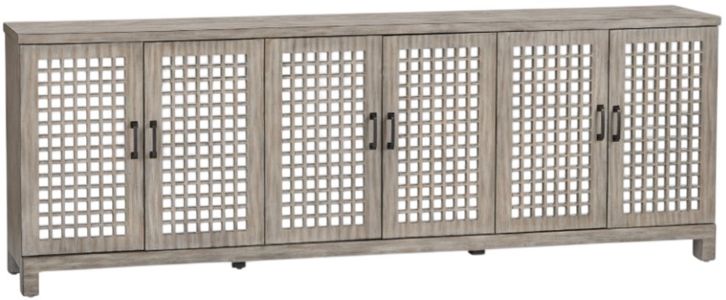 Showcase and store in one sleek sweep. A wire-brushed grey frame spans 90 inches, fronted by tempered-glass doors overlaid with geometric lattice for instant pattern. Inside, adjustable shelves and rear cord ports tidy gaming gear, serving pieces or stereo components while block feet keep the profile clean and modern.Read More