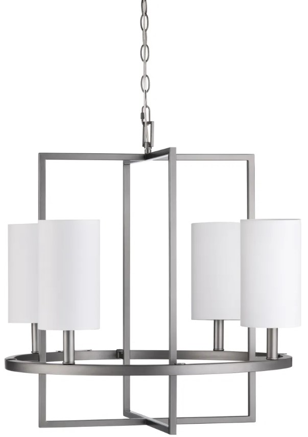 Crestview Collection's Fields Four Light Chandelier is the epitome of modern-industrial elegance. This open metal, cage-style design is crafted in a satin gunmetal finish and includes four white linen lamp shades. Candelabra bulbs are required for illumination and mounting hardware is included.Read More